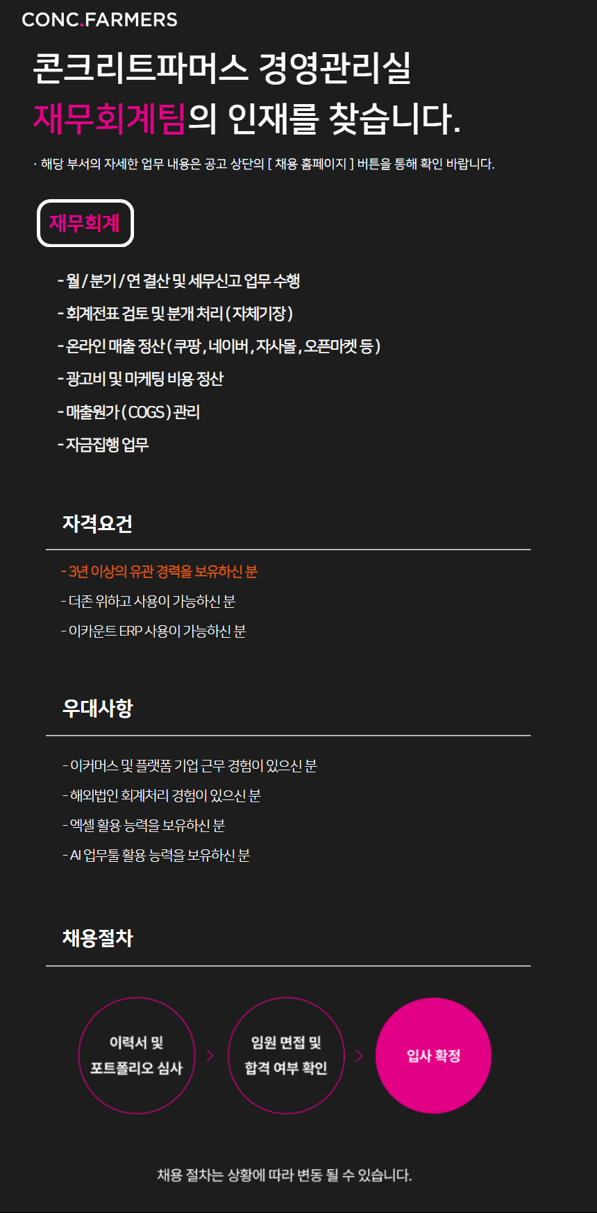 [경영관리실] 재무회계 담당자 채용 | (주)콘크리트파머스